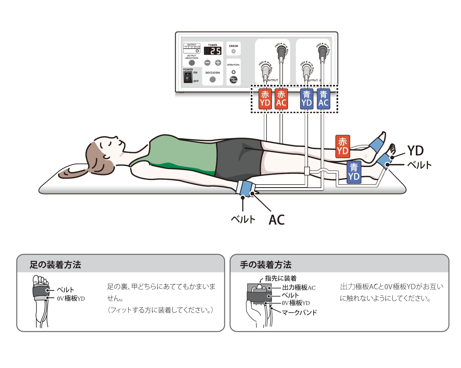 ・治療器本体の設置場所から,極板を装着し使用する場所までの距離以上の極板ケーブル長が必要です。
